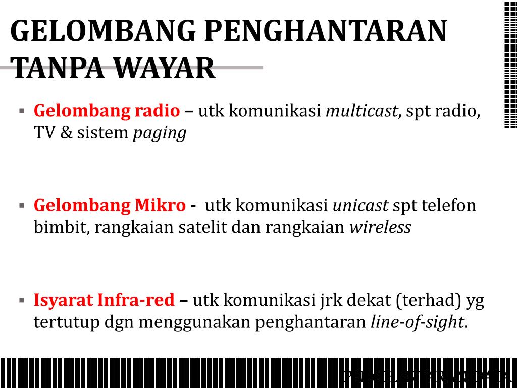 GELOMBANG PENGHANTARAN TANPA WAYAR • Gelombang radio– utk komunikasi multicast, spt radio, TV & sistem paging • Gelombang Mikro - utk komunikasi unicast spt telefon bimbit, rangkaian satelit dan rangkaian wireless • Isyarat Infra-red – utk komunikasi jrk dekat (terhad) yg tertutup dgn menggunakan penghantaran line-of-sight. PENGHANTARAN DATA