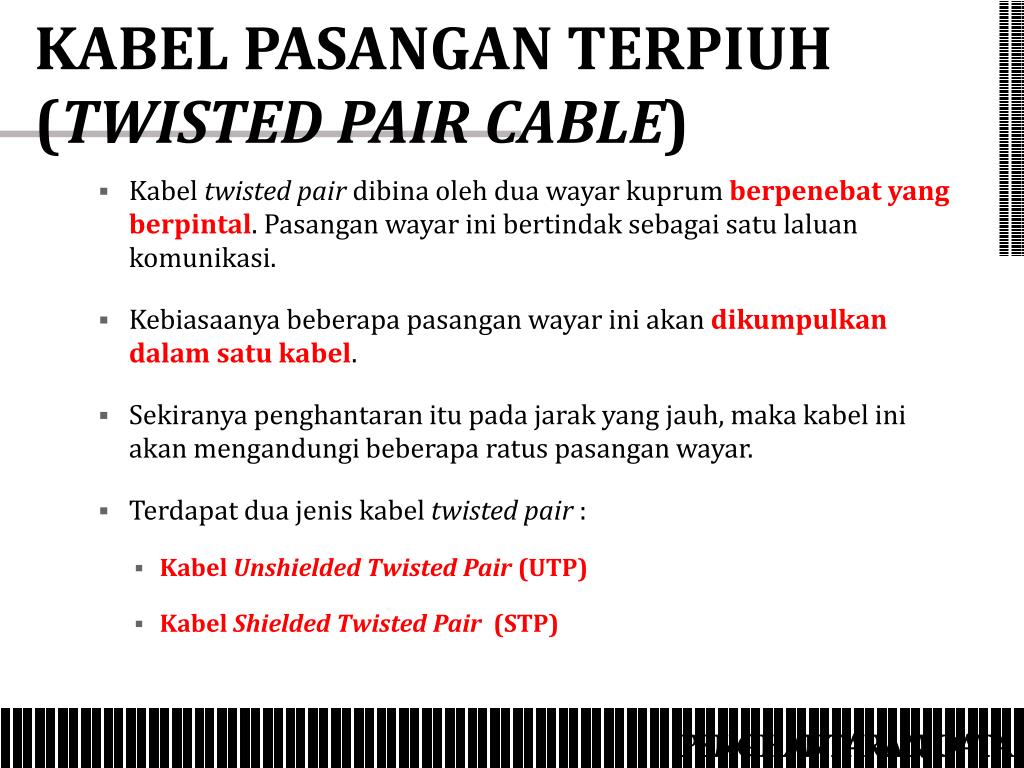 KABEL PASANGAN TERPIUH (TWISTED PAIR CABLE) • Kabeltwisted pairdibinaolehduawayarkuprumberpenebat yang berpintal. Pasanganwayarinibertindaksebagaisatulaluankomunikasi. • Kebiasaanyabeberapapasanganwayariniakandikumpulkandalamsatukabel. • Sekiranyapenghantaranitupadajarak yang jauh, makakabeliniakanmengandungibeberaparatuspasanganwayar. • Terdapatduajeniskabeltwisted pair : • KabelUnshielded Twisted Pair (UTP) • KabelShielded Twisted Pair (STP) PENGHANTARAN DATA