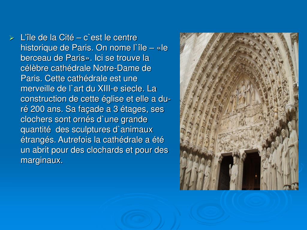 L’île de la Cité – c`est le centre historique de Paris. On nome l`île – «le berceau de Paris». Ici se trouve la célèbre cathédrale Notre-Dame de Paris. Cette cathédrale est une merveille de l`art du XIII-e siecle. La construction de cette église et elle a du- ré 200 ans. Sa façade a 3 étages, ses clochers sont ornés d`une grande quantité des sculptures d`animaux étrangés. Autrefois la cathédrale a été un abrit pour des clochards et pour des marginaux.