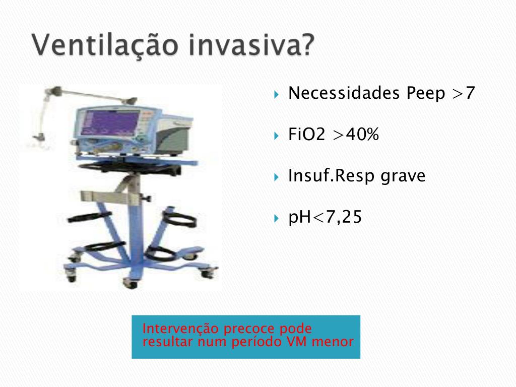 Necessidades Peep >7 • FiO2 >40% • Insuf.Resp grave • pH<7,25 Intervenção precoce pode resultar num período VM menor