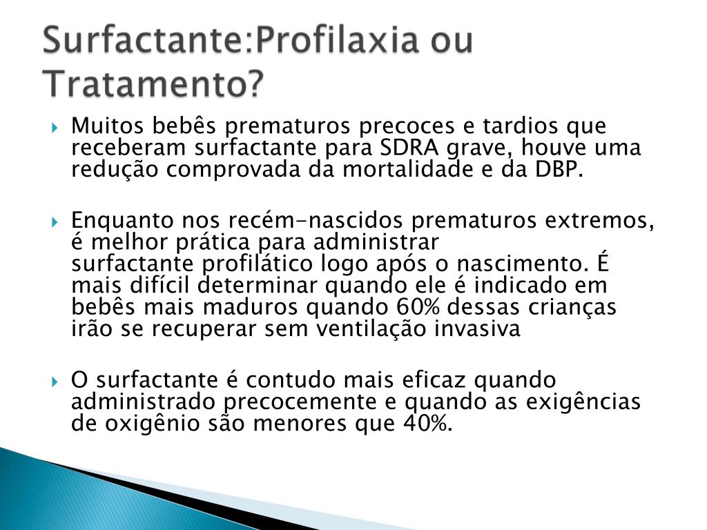 Muitos bebês prematuros precoces e tardios que receberam surfactante para SDRA grave, houve uma redução comprovada da mortalidade e da DBP. • Enquanto nos recém-nascidos prematuros extremos, é melhor prática para administrarsurfactante profilático logo após o nascimento. É mais difícil determinar quando ele é indicado em bebês mais maduros quando 60% dessas crianças irão se recuperar sem ventilação invasiva • O surfactante é contudo mais eficaz quando administrado precocemente e quando as exigências de oxigênio são menores que 40%.