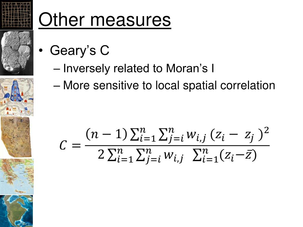 Other measures • Geary’s C • Inversely related to Moran’s I • More sensitive to local spatial correlation