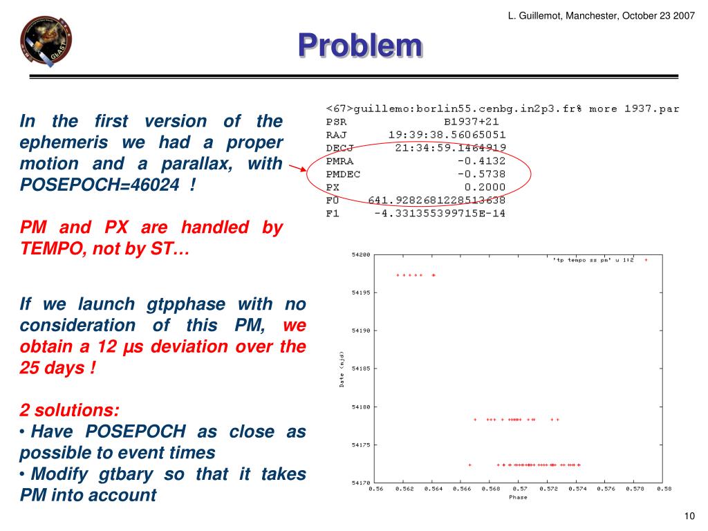 L. Guillemot, Manchester, October 23 2007 Problem In the first version of the ephemeris we had a proper motion and a parallax, with POSEPOCH=46024 ! PM and PX are handled by TEMPO, not by ST… • If we launch gtpphase with no consideration of this PM, we obtain a 12 µs deviation over the 25 days ! • 2 solutions: • Have POSEPOCH as close as possible to event times • Modify gtbary so that it takes PM into account • 10