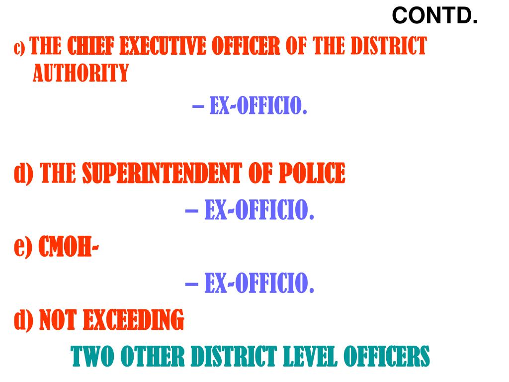 CONTD. c) THE CHIEF EXECUTIVE OFFICER OF THE DISTRICT AUTHORITY – EX-OFFICIO. d) THE SUPERINTENDENT OF POLICE – EX-OFFICIO. e) CMOH- – EX-OFFICIO. d) NOT EXCEEDING TWO OTHER DISTRICT LEVEL OFFICERS TO BE APPOINTED BY THE STATE GOVT.