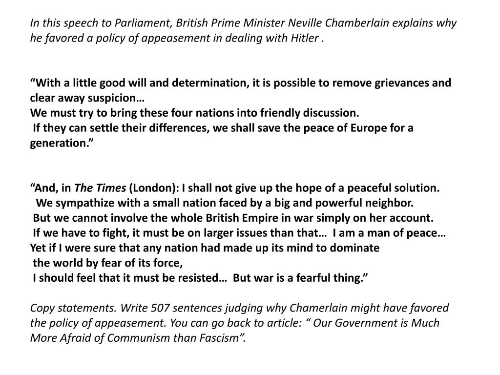 In this speech to Parliament, British Prime Minister Neville Chamberlain explains why he favored a policy of appeasement in dealing with Hitler . • “With a little good will and determination, it is possible to remove grievances and clear away suspicion… • We must try to bring these four nations into friendly discussion. • If they can settle their differences, we shall save the peace of Europe for a generation.” • “And, in The Times (London): I shall not give up the hope of a peaceful solution. • We sympathize with a small nation faced by a big and powerful neighbor. • But we cannot involve the whole British Empire in war simply on her account. • If we have to fight, it must be on larger issues than that… I am a man of peace… • Yet if I were sure that any nation had made up its mind to dominate • the world by fear of its force, • I should feel that it must be resisted… But war is a fearful thing.” • Copy statements. Write 507 sentences judging why Chamerlain might have favored the policy of appeasement. You can go back to article: “ Our Government is Much More Afraid of Communism than Fascism”.