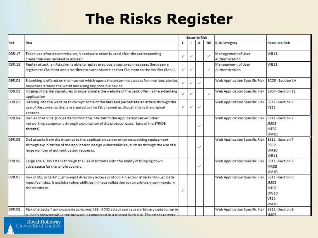 FurtherStudyIdeas • Focus the study on other web-application types, eg: e-shopping, social networking etc. • Focus the study on mobile-banking applications • Focus the study on cloud-based applications • Apply the same methodology for supporting other areas such as Enterprise-wide Security Risk Management