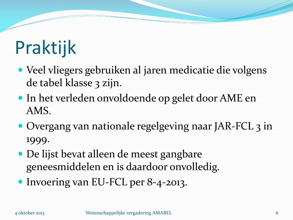 Praktijk • Veel vliegers gebruiken al jaren medicatie die volgens de tabel klasse 3 zijn. • In het verleden onvoldoende op gelet door AME en AMS. • Overgang van nationale regelgeving naar JAR-FCL 3 in 1999. • De lijst bevat alleen de meest gangbare geneesmiddelen en is daardoor onvolledig. • Invoering van EU-FCL per 8-4-2013. Wetenschappelijke vergadering AMABEL