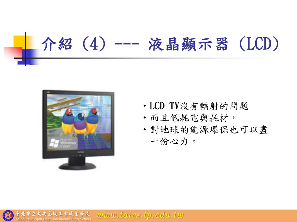 介紹 (4) --- 液晶顯示器 (LCD) • LCD TV沒有輻射的問題 • 而且低耗電與耗材, • 對地球的能源環保也可以盡 • 一份心力。