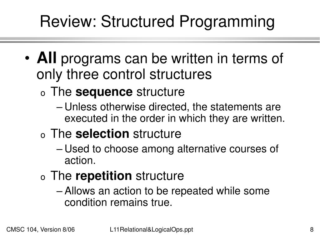 Review: Structured Programming • All programs can be written in terms of only three control structures • The sequence structure • Unless otherwise directed, the statements are executed in the order in which they are written. • The selection structure • Used to choose among alternative courses of action. • The repetition structure • Allows an action to be repeated while some condition remains true.
