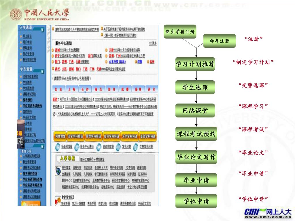 新生学籍注册 学年注册 “注册” 学习计划推荐 “制定学习计划” 学生选课 “交费选课” “课程学习” 网络课堂 “课程考试” 课程考试预约 “毕业论文” 毕业论文写作 “毕业申请” 毕业申请 “学位申请” 学位申请