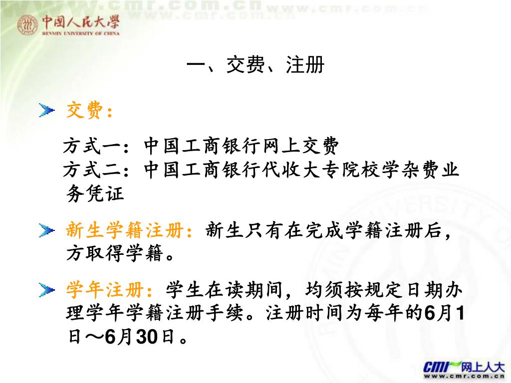 201009 学籍批次新生导学 网上人大. 新生学籍注册. 学年注册. “ 注册”. 学习计划推荐. “ 制定学习计划”. 学生选课. “ 交费选课”. “ 课程学习”. 网络课堂. “ 课程考试”. 课程考试预约. “ 毕业论文”. 毕业论文写作. “ 毕业申请”. 毕业申请. “ 学位申请”. 学位申请. 一、交费、注册. 交费: 方式一:中国工商银行网上交费 方式二:中国工商银行代收大专院校学杂费业务凭证 新生学籍注册: 新生只有在完成学籍注册后,方取得学籍。