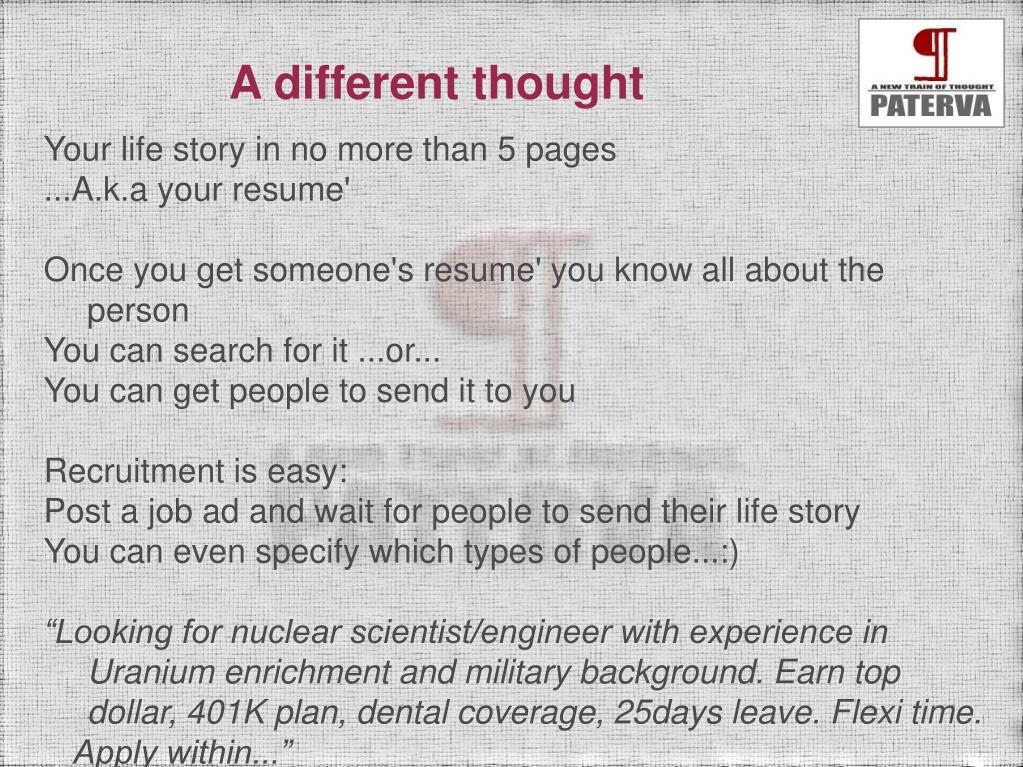 A different thought Your life story in no more than 5 pages ...A.k.a your resume' Once you get someone's resume' you know all about the person You can search for it ...or... You can get people to send it to you Recruitment is easy: Post a job ad and wait for people to send their life story You can even specify which types of people...:) “Looking for nuclear scientist/engineer with experience in Uranium enrichment and military background. Earn top dollar, 401K plan, dental coverage, 25days leave. Flexi time. Apply within...”