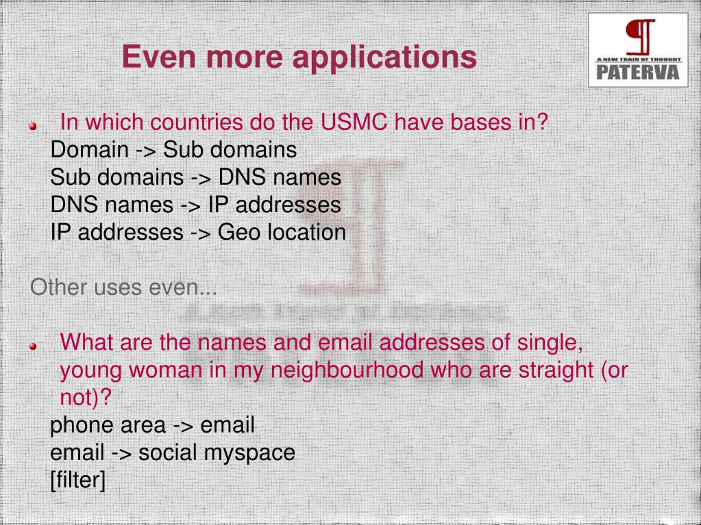 Even more applications • In which countries do the USMC have bases in? Domain -> Sub domains Sub domains -> DNS names DNS names -> IP addresses IP addresses -> Geo location Other uses even... • What are the names and email addresses of single, young woman in my neighbourhood who are straight (or not)? phone area -> email email -> social myspace [filter]