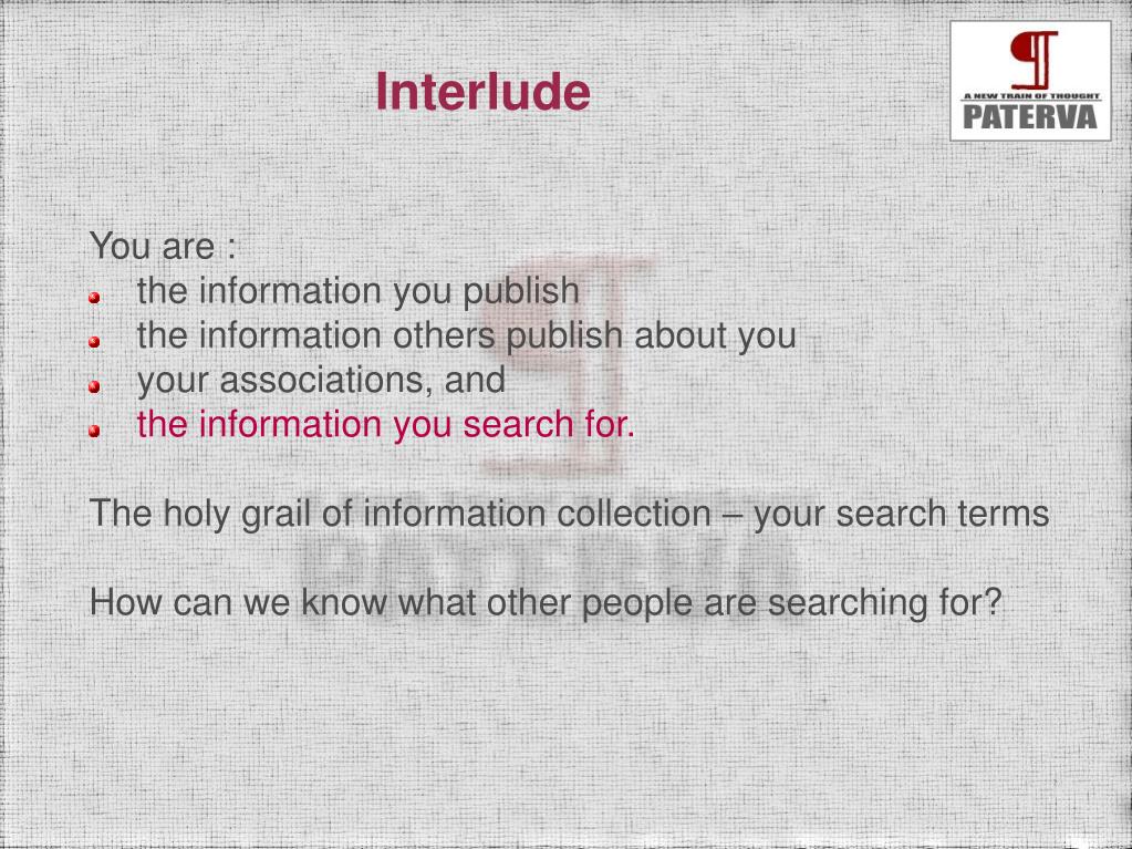 Interlude You are : • the information you publish • the information others publish about you • your associations, and • the information you search for. The holy grail of information collection – your search terms How can we know what other people are searching for?