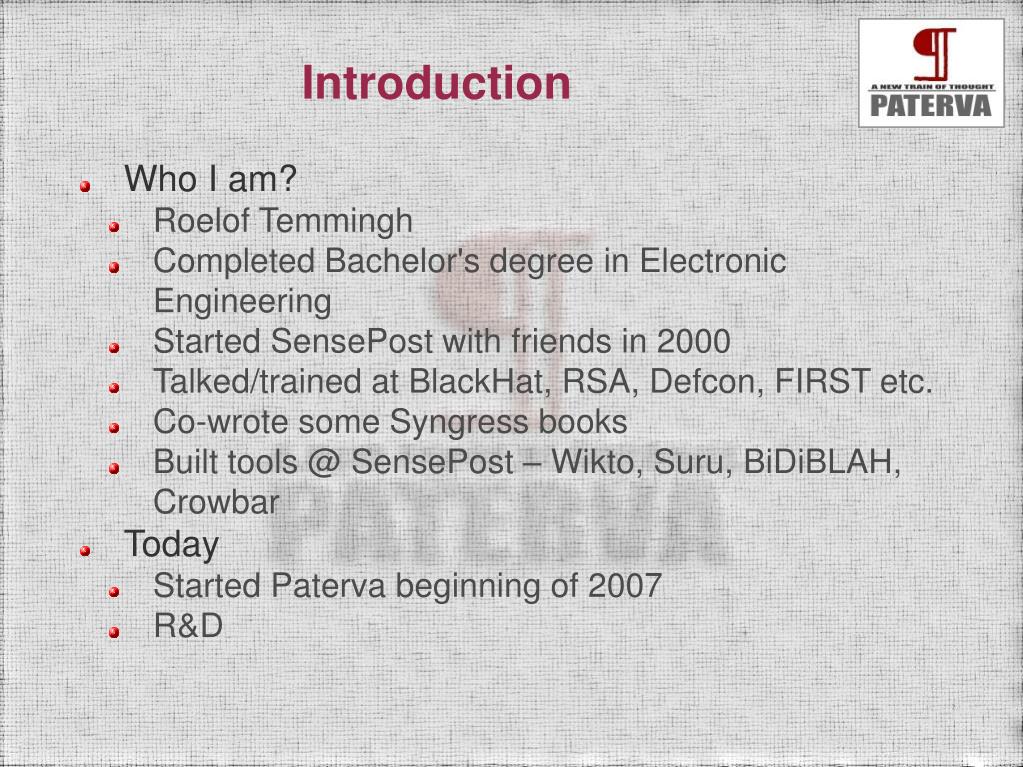 Introduction • Who I am? • Roelof Temmingh • Completed Bachelor's degree in Electronic Engineering • Started SensePost with friends in 2000 • Talked/trained at BlackHat, RSA, Defcon, FIRST etc. • Co-wrote some Syngress books • Built tools @ SensePost – Wikto, Suru, BiDiBLAH, Crowbar • Today • Started Paterva beginning of 2007 • R&D