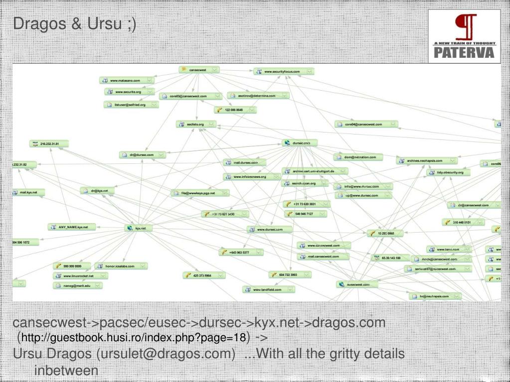 Dragos & Ursu ;) cansecwest->pacsec/eusec->dursec->kyx.net->dragos.com (http://guestbook.husi.ro/index.php?page=18) -> Ursu Dragos (ursulet@dragos.com) ...With all the gritty details inbetween