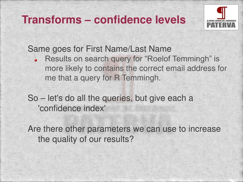 Transforms – confidence levels Same goes for First Name/Last Name • Results on search query for “Roelof Temmingh” is more likely to contains the correct email address for me that a query for R Temmingh. So – let's do all the queries, but give each a 'confidence index' Are there other parameters we can use to increase the quality of our results?