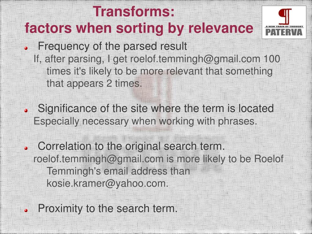Transforms: factors when sorting by relevance • Frequency of the parsed result If, after parsing, I get roelof.temmingh@gmail.com 100 times it's likely to be more relevant that something that appears 2 times. • Significance of the site where the term is located Especially necessary when working with phrases. • Correlation to the original search term. roelof.temmingh@gmail.com is more likely to be Roelof Temmingh's email address than kosie.kramer@yahoo.com. • Proximity to the search term.