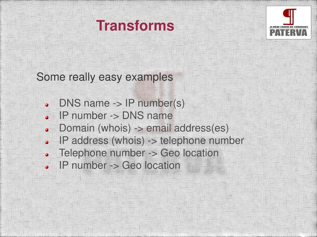 Transforms Some really easy examples • DNS name -> IP number(s) • IP number -> DNS name • Domain (whois) -> email address(es) • IP address (whois) -> telephone number • Telephone number -> Geo location • IP number -> Geo location