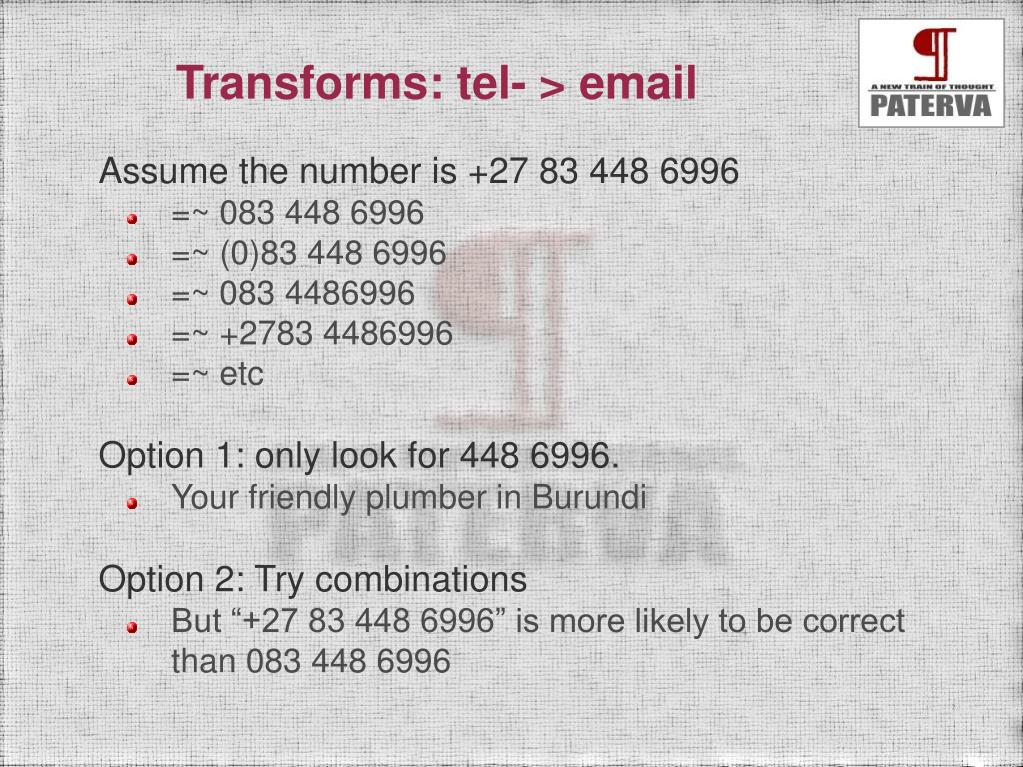 Transforms: tel- > email Assume the number is +27 83 448 6996 • =~ 083 448 6996 • =~ (0)83 448 6996 • =~ 083 4486996 • =~ +2783 4486996 • =~ etc Option 1: only look for 448 6996. • Your friendly plumber in Burundi Option 2: Try combinations • But “+27 83 448 6996” is more likely to be correct than 083 448 6996