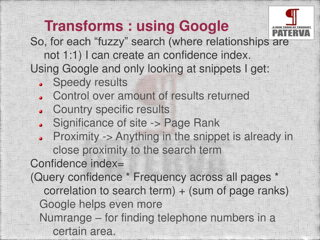 Transforms : using Google So, for each “fuzzy” search (where relationships are not 1:1) I can create an confidence index. Using Google and only looking at snippets I get: • Speedy results • Control over amount of results returned • Country specific results • Significance of site -> Page Rank • Proximity -> Anything in the snippet is already in close proximity to the search term Confidence index= (Query confidence * Frequency across all pages * correlation to search term) + (sum of page ranks) Google helps even more Numrange – for finding telephone numbers in a certain area.