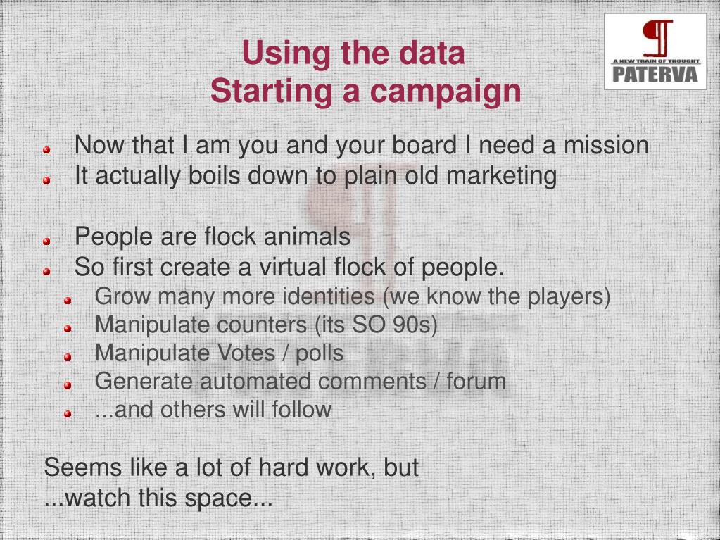Using the dataStarting a campaign • Now that I am you and your board I need a mission • It actually boils down to plain old marketing • People are flock animals • So first create a virtual flock of people. • Grow many more identities (we know the players) • Manipulate counters (its SO 90s) • Manipulate Votes / polls • Generate automated comments / forum • ...and others will follow Seems like a lot of hard work, but ...watch this space...