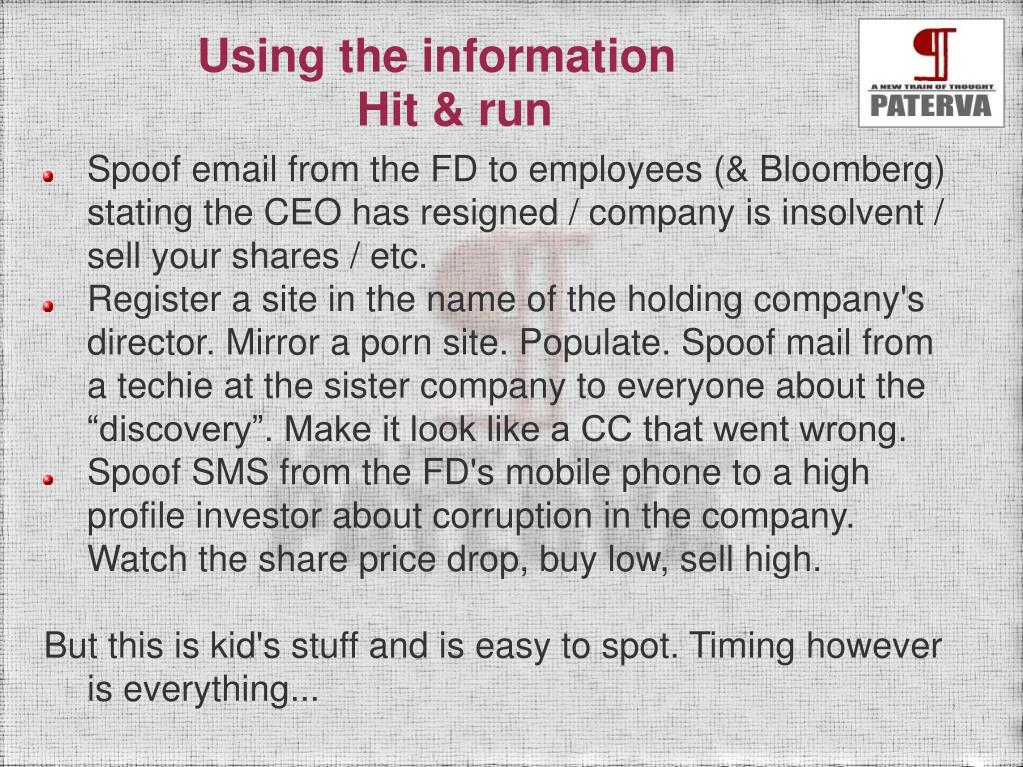 Using the informationHit & run • Spoof email from the FD to employees (& Bloomberg) stating the CEO has resigned / company is insolvent / sell your shares / etc. • Register a site in the name of the holding company's director. Mirror a porn site. Populate. Spoof mail from a techie at the sister company to everyone about the “discovery”. Make it look like a CC that went wrong. • Spoof SMS from the FD's mobile phone to a high profile investor about corruption in the company. Watch the share price drop, buy low, sell high. But this is kid's stuff and is easy to spot. Timing however is everything...