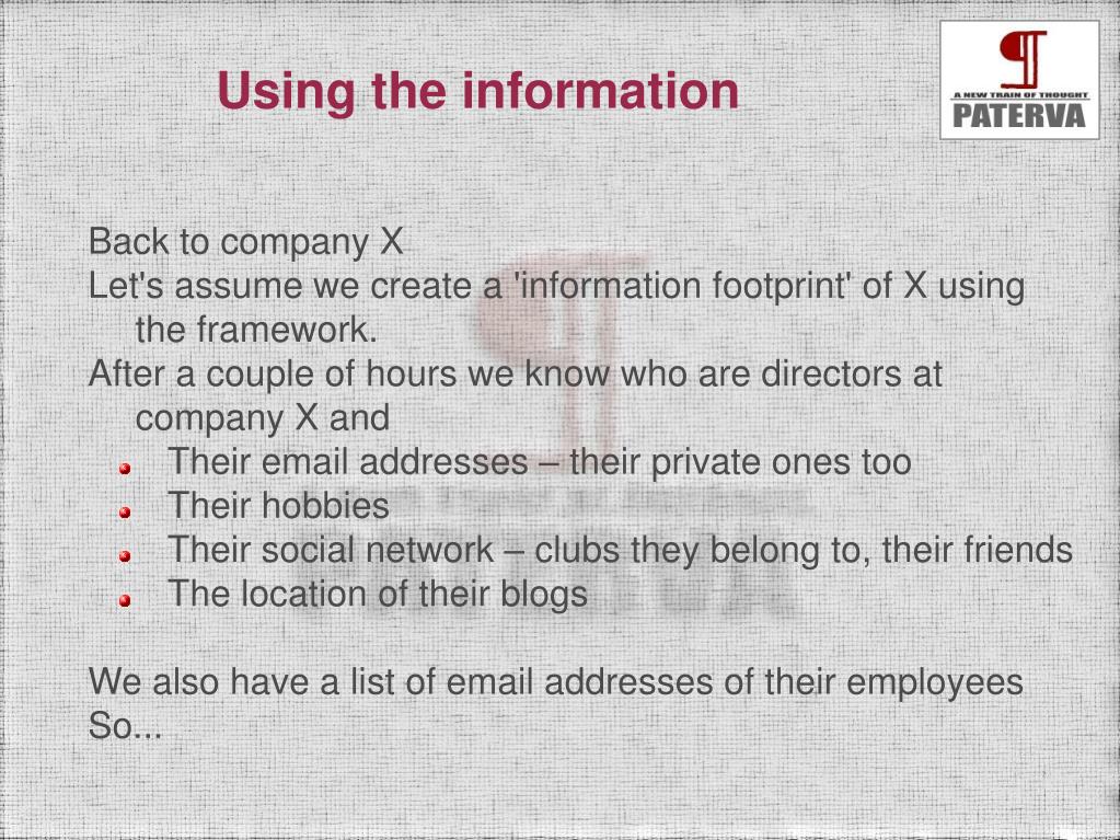 Using the information Back to company X Let's assume we create a 'information footprint' of X using the framework. After a couple of hours we know who are directors at company X and • Their email addresses – their private ones too • Their hobbies • Their social network – clubs they belong to, their friends • The location of their blogs We also have a list of email addresses of their employees So...