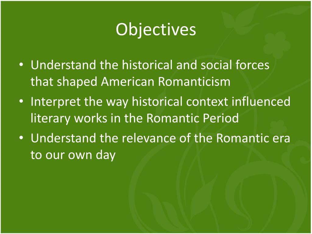 Objectives • Understand the historical and social forces that shaped American Romanticism • Interpret the way historical context influenced literary works in the Romantic Period • Understand the relevance of the Romantic era to our own day
