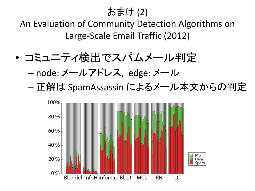 おまけ (2)An Evaluation of Community Detection Algorithms on Large-Scale Email Traffic (2012) • コミュニティ検出でスパムメール判定 • node: メールアドレス,edge: メール • 正解は SpamAssassinによるメール本文からの判定