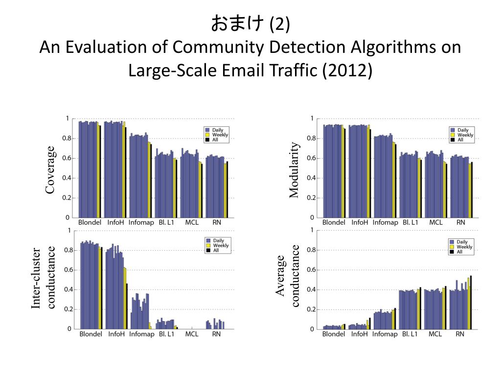 おまけ (2)An Evaluation of Community Detection Algorithms on Large-Scale Email Traffic (2012) Modularity Coverage Inter-cluster conductance Average conductance