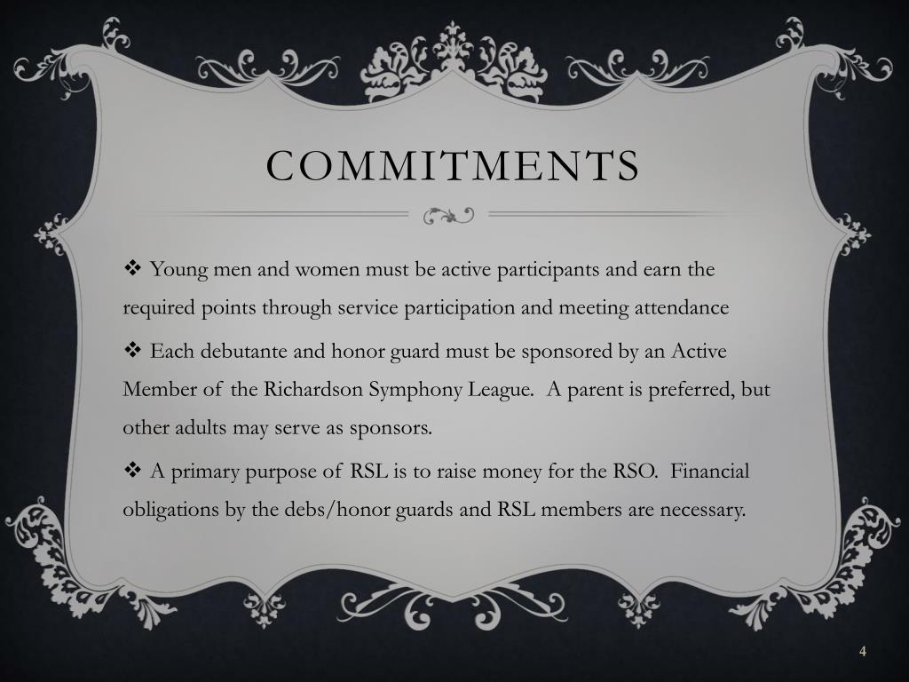 Commitments • Young men and women must be active participants and earn the required points through service participation and meeting attendance • Each debutante and honor guard must be sponsored by an Active Member of the Richardson Symphony League. A parent is preferred, but other adults may serve as sponsors. • A primary purpose of RSL is to raise money for the RSO. Financial obligations by the debs/honor guards and RSL members are necessary.