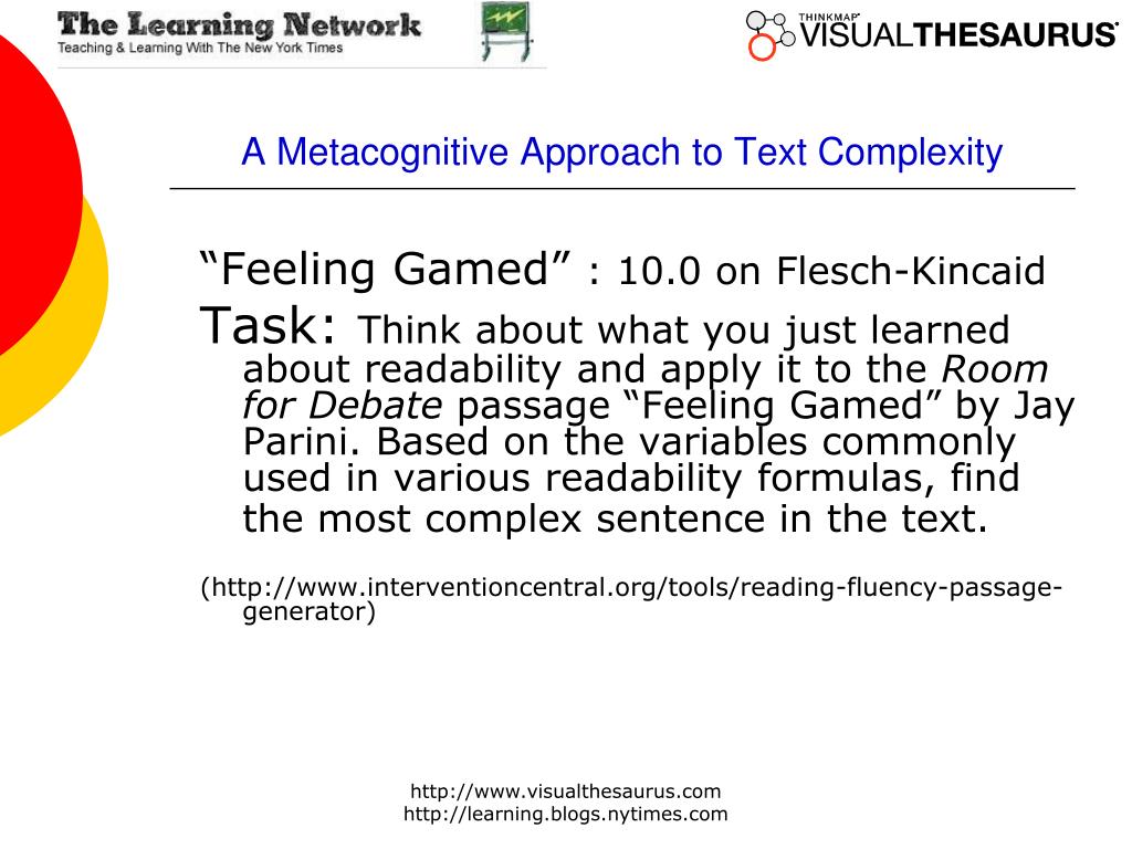 A Metacognitive Approach to Text Complexity “Feeling Gamed” : 10.0 on Flesch-Kincaid Task: Think about what you just learned about readability and apply it to the Room for Debate passage “Feeling Gamed” by Jay Parini. Based on the variables commonly used in various readability formulas, find the most complex sentence in the text. (http://www.interventioncentral.org/tools/reading-fluency-passage-generator) http://www.visualthesaurus.comhttp://learning.blogs.nytimes.com