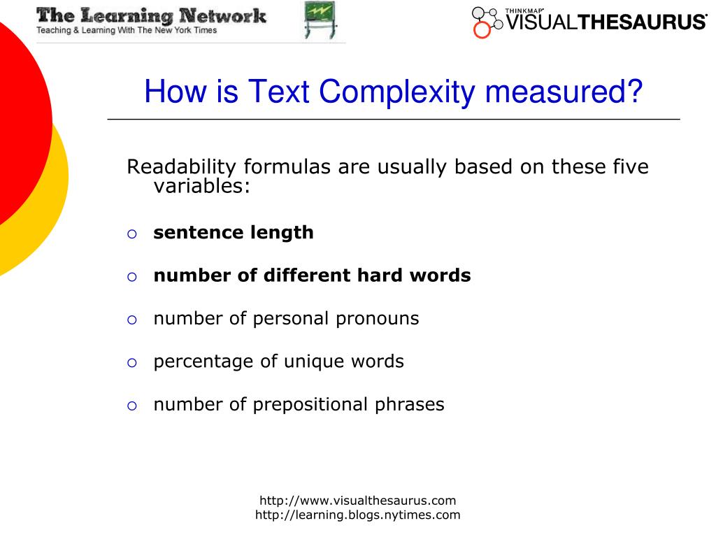 How is Text Complexity measured? Readability formulas are usually based on these five variables: sentence length number of different hard words number of personal pronouns percentage of unique words number of prepositional phrases http://www.visualthesaurus.comhttp://learning.blogs.nytimes.com