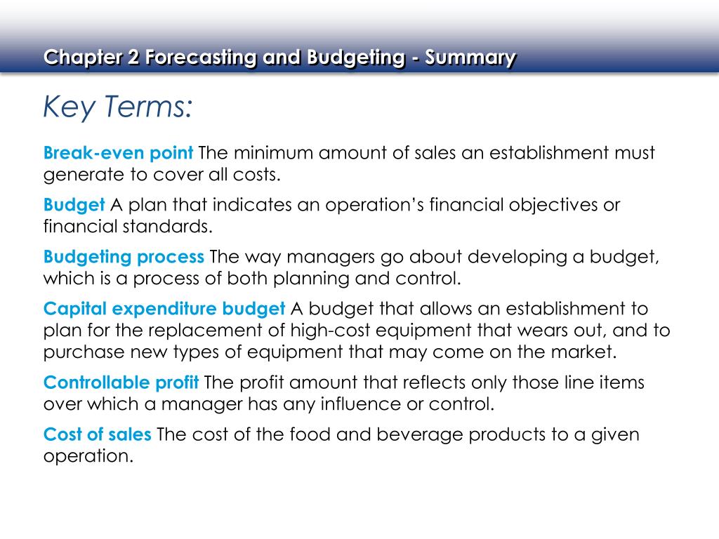 Key Terms: Break-even point The minimum amount of sales an establishment must generate to cover all costs. Budget A plan that indicates an operation’s financial objectives or financial standards. Budgeting process The way managers go about developing a budget, which is a process of both planning and control. Capital expenditure budget A budget that allows an establishment to plan for the replacement of high-cost equipment that wears out, and to purchase new types of equipment that may come on the market. Controllable profit The profit amount that reflects only those line items over which a manager has any influence or control. Cost of sales The cost of the food and beverage products to a given operation.