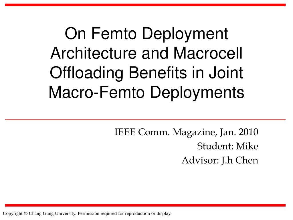 On Femto Deployment Architecture and Macrocell Offloading Benefits in Joint Macro-Femto Deployments IEEE Comm. Magazine, Jan. 2010 Student:Mike Advisor: J.h Chen