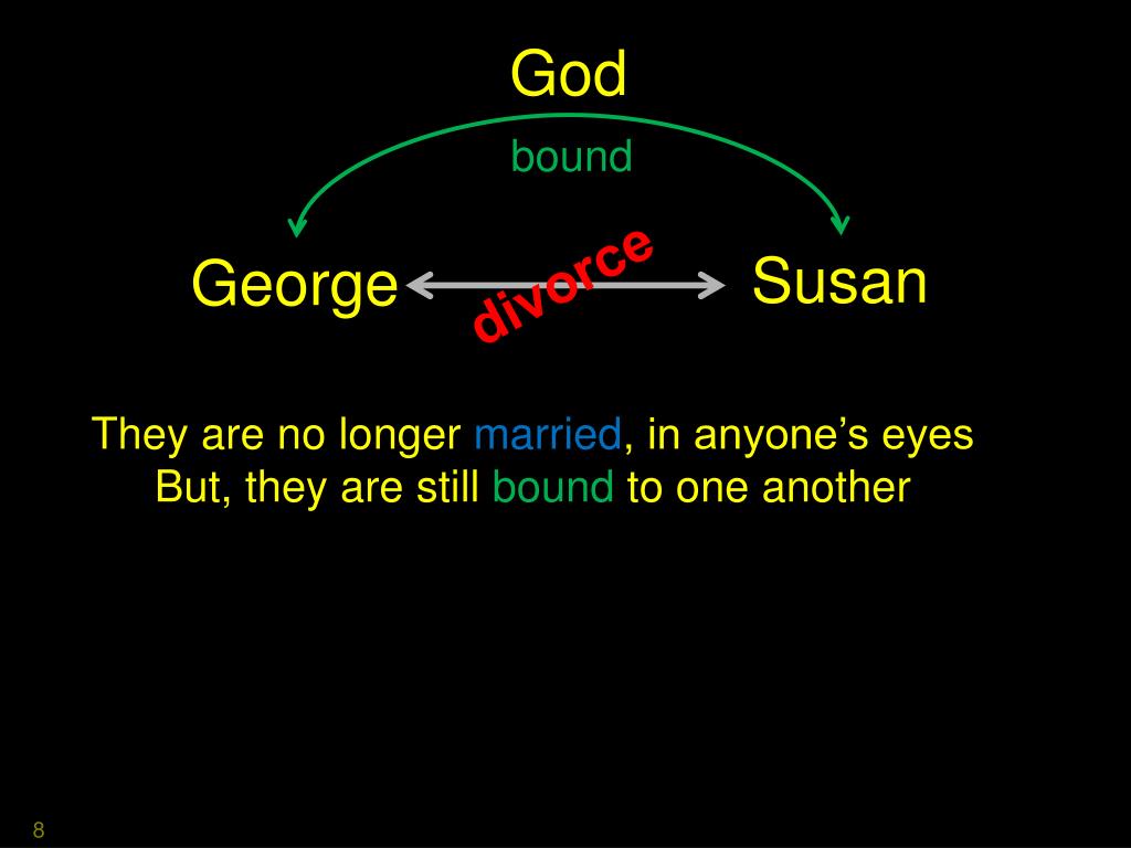 Marriage & Divorce:. The Difference between Married & Bound. Married - Bound. Legal union of man & woman as husband and wife. Under obligations and restraints inherent in the covenant with God. God. bound. Susan. George. Married. God. bound. Susan. George. Married. God. bound.