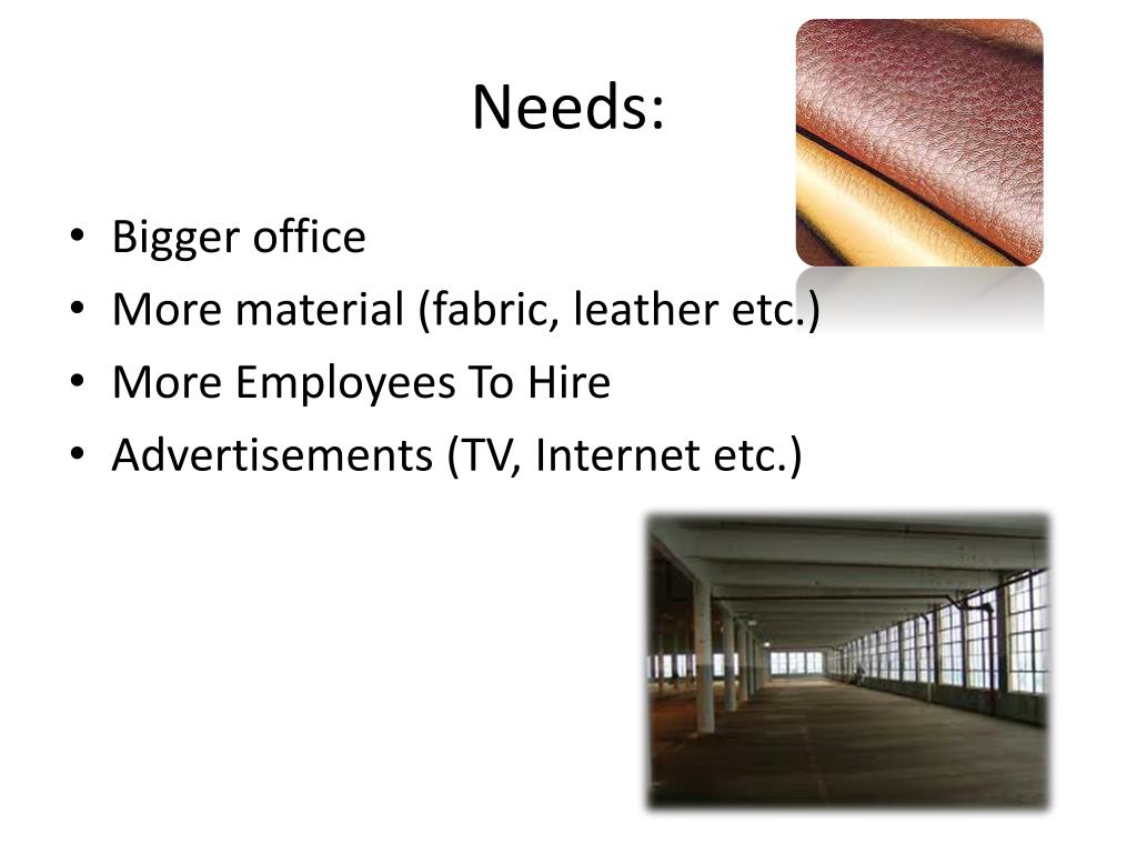 Needs: • Bigger office • More material (fabric, leather etc.) • More Employees To Hire • Advertisements (TV, Internet etc.)