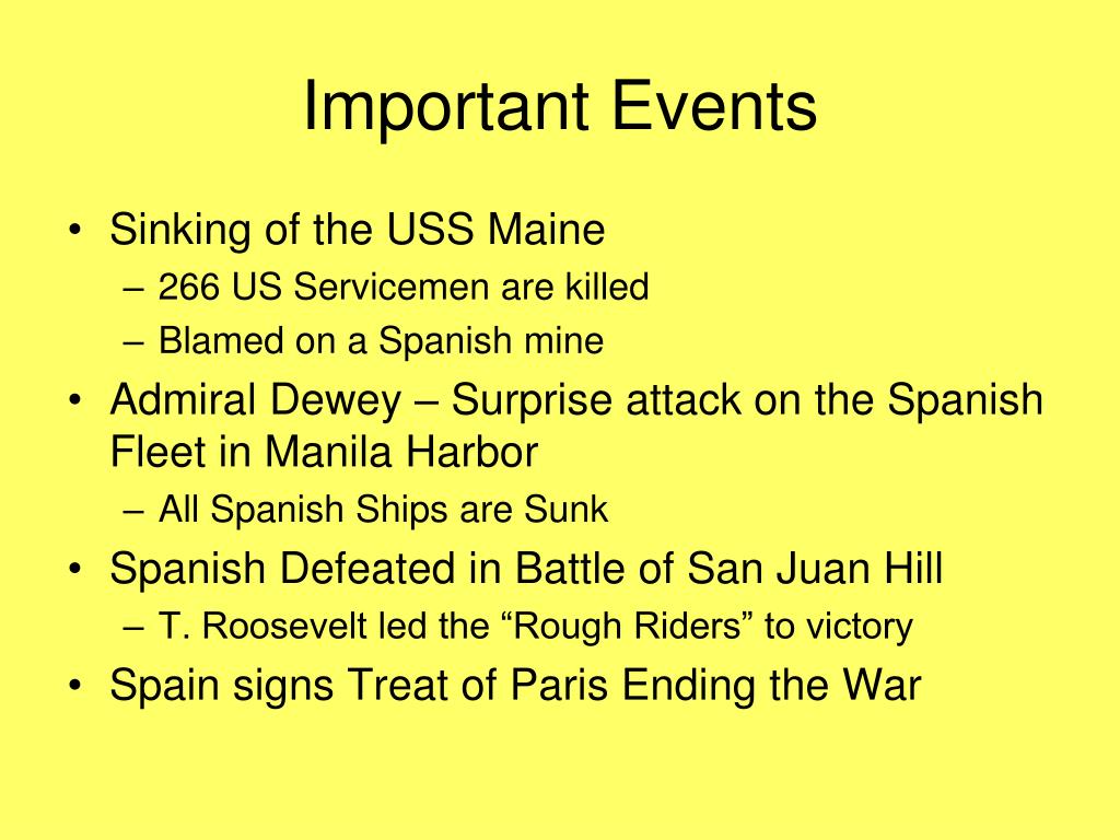 Important Events • Sinking of the USS Maine • 266 US Servicemen are killed • Blamed on a Spanish mine • Admiral Dewey – Surprise attack on the Spanish Fleet in Manila Harbor • All Spanish Ships are Sunk • Spanish Defeated in Battle of San Juan Hill • T. Roosevelt led the “Rough Riders” to victory • Spain signs Treat of Paris Ending the War