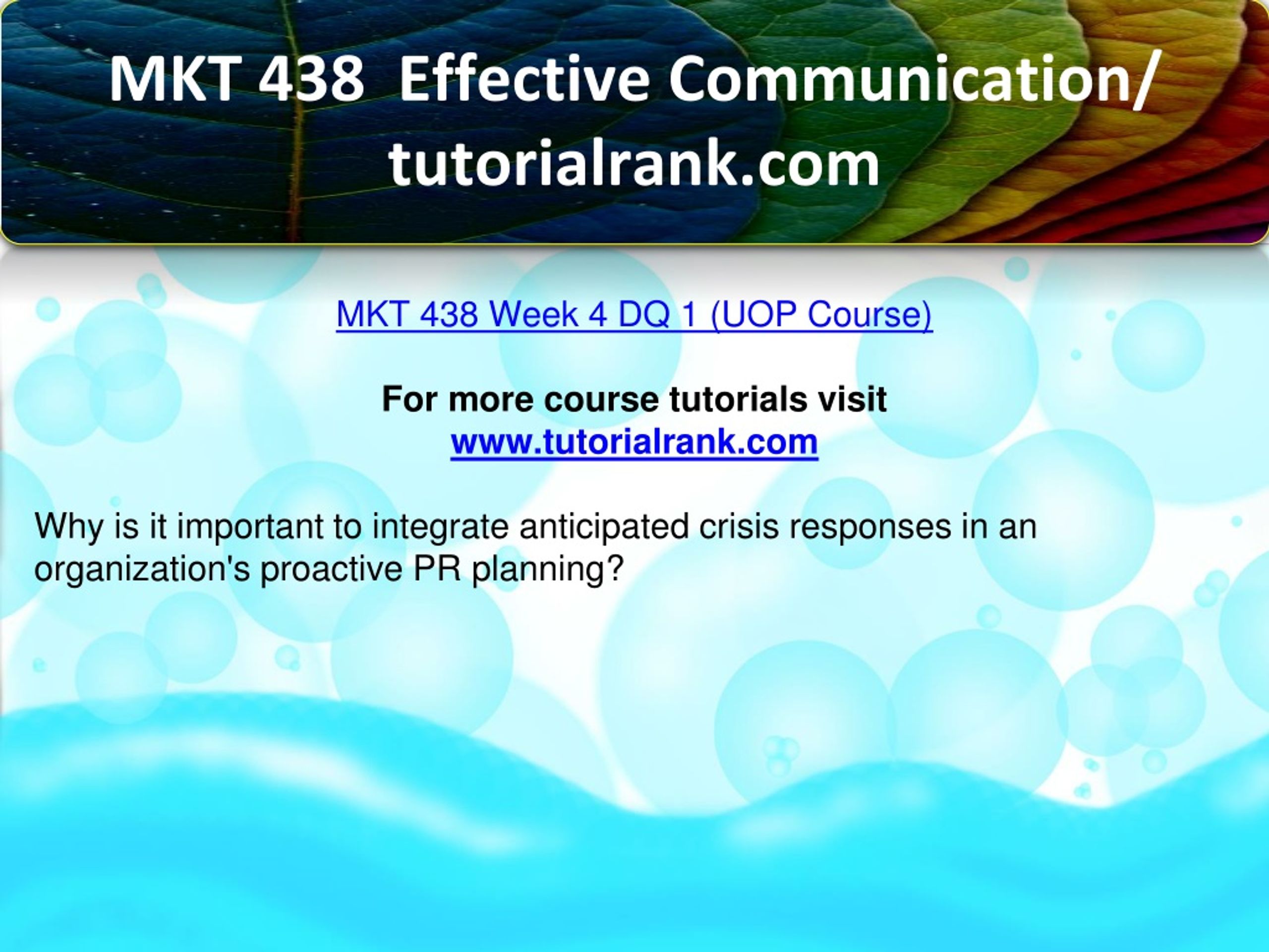 MKT 438 Effective Communication/ tutorialrank.com MKT 438 Week 4 DQ 1 (UOP Course) For more course tutorials visit www.tutorialrank.com Why is it important to integrate anticipated crisis responses in an organization's proactive PR planning?