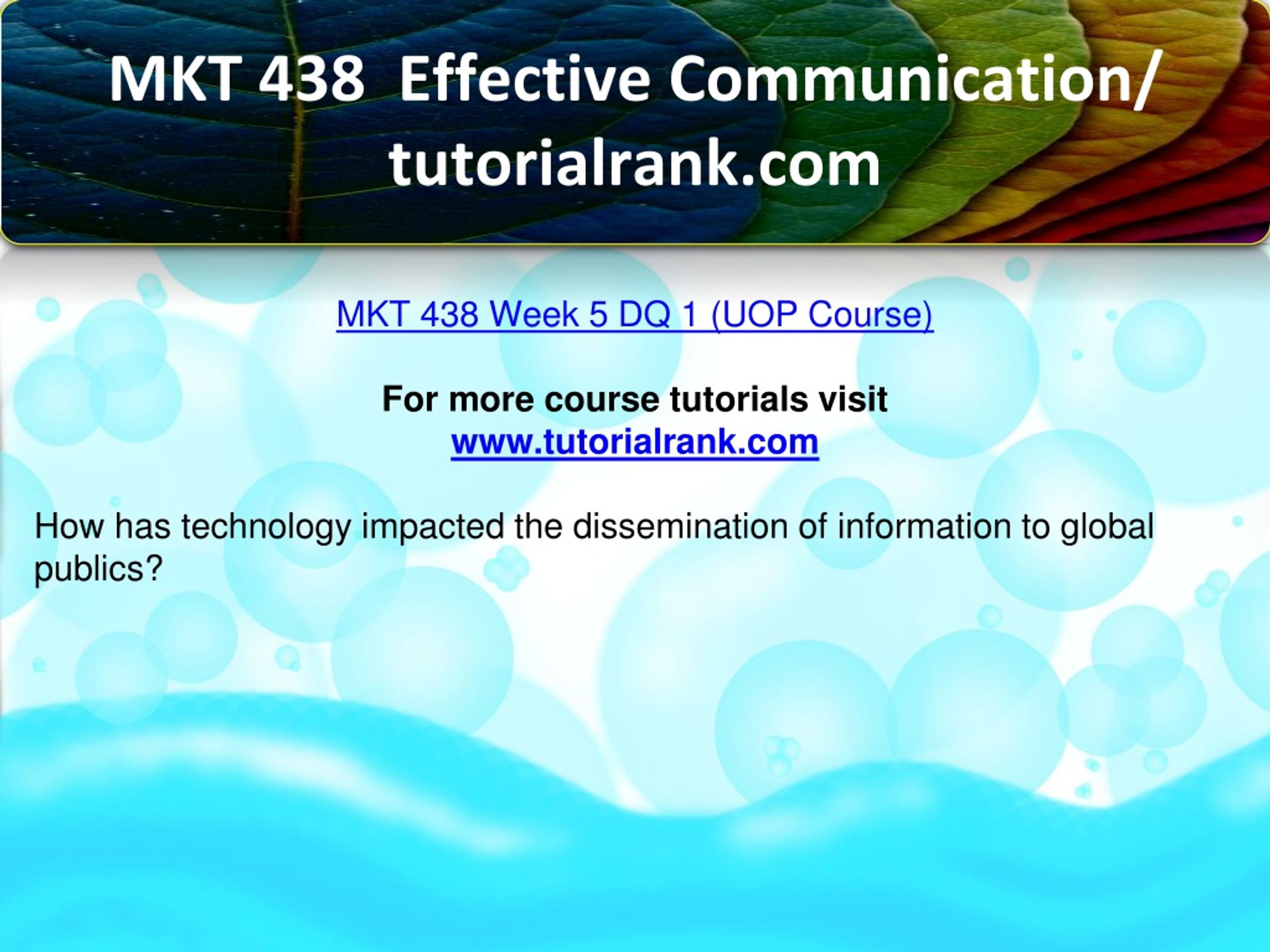 MKT 438 Effective Communication/ tutorialrank.com MKT 438 Week 5 DQ 1 (UOP Course) For more course tutorials visit www.tutorialrank.com How has technology impacted the dissemination of information to global publics?