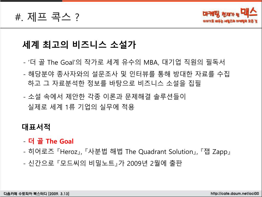 다음카페 수토피아 북스터디 3. 마케팅 천재가 된 맥스. 일시 : 2009. 3. 13 7:30 PM 장소 : 부산 KHC 교육원 진행 : 이 동 헌 ( 도서관컬럼지기 ) Email. etlaw@hanmail.net NateOn . etlaw@nate.com. #. 제프 콕스 ?. 세계 최고의 비즈니스 소설가. - ‘ 더 골 The Goal’ 의 작가로 세계 유수의 MBA, 대기업 직원의 필독서 - 해당분야 종사자와의 설문조사 및 인터뷰를 통해 방대한 자료를 수집