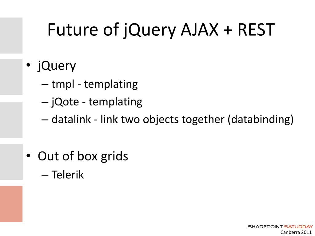Future of jQuery AJAX + REST • jQuery • tmpl - templating • jQote - templating • datalink - link two objects together (databinding) • Out of box grids • Telerik