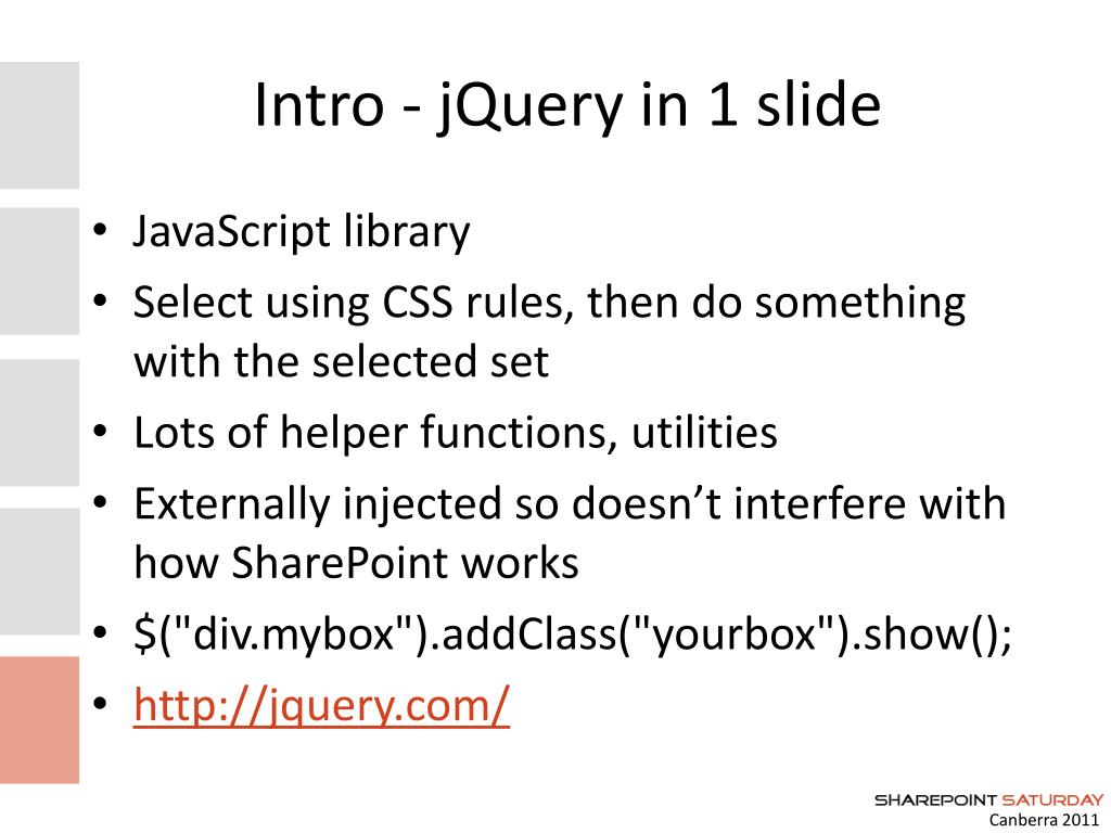 Intro - jQuery in 1 slide • JavaScript library • Select using CSS rules, then do something with the selected set • Lots of helper functions, utilities • Externally injected so doesn’t interfere with how SharePoint works • $("div.mybox").addClass("yourbox").show(); • http://jquery.com/