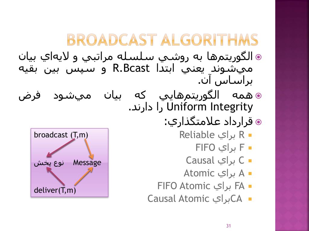 Broadcast Algorithms • الگوريتمها به روشي سلسله مراتبي و لايهاي بيان ميشوند يعني ابتدا R.Bcast و سپس بين بقيه براساس آن. • همه الگوريتمهايي که بيان ميشود فرض Uniform Integrity را دارند. • قرارداد علامتگذاري: • R براي Reliable • F براي FIFO • C براي Causal • A براي Atomic • FA براي FIFO Atomic • CA براي Causal Atomic broadcast (T,m) نوع پخش Message deliver(T,m)