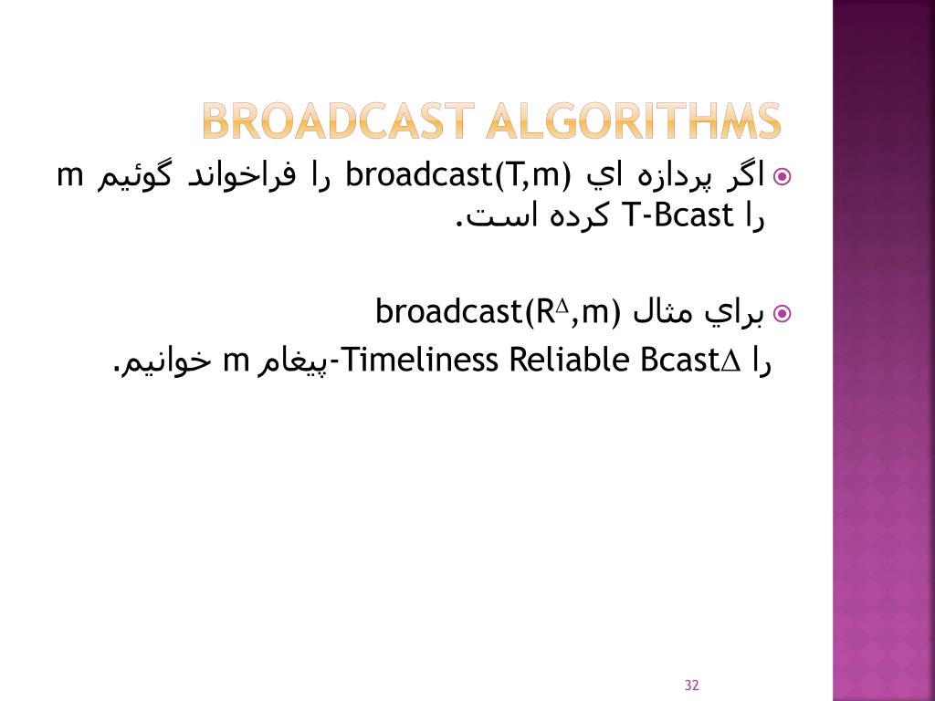 Timed Broadcast • خيلي از کاربردها نياز دارند که اگر پيغامي دريافت شد حتما در يک محدوده زماني مشخصي از لحظه پخش دريافت شود. اين ويژگي را -timeliness گويند. • زمان به يکي از دو شکل زمان واقعيو زمان محلي اندازه گيري مي شود. • -timeliness(با زمان واقعي): اگر پيغامي در لحظه t پخش شد، هيچ پردازه درستي آنرا پس از t+t دريافت نکند. • در مورد زمان محلي، بايد تفاوت زماني بين زمان محلي پخشکننده و تحويل گيرنده محدود باشد. • فرض ميکنيم که هر پيغام m شامل يک زمانمهر ts(m) است که زمان پخشکننده را مشخص مي کند. • -timeliness(با زمان محلي): يي وجود دارد که هيچ پردازه درستي (p)، پيغام m را پس از ts(m)+(برحسب ساعت p) دريافت نميکند.