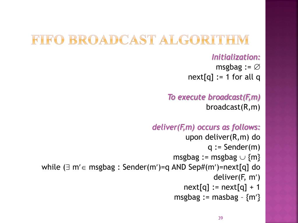 FIFO Broadcast Algorithm Initialization: msgbag := next[q] := 1 for all q To execute broadcast(F,m) broadcast(R,m) deliver(F,m) occurs as follows: upon deliver(R,m) do q := Sender(m) msgbag := msgbag {m} while ( m msgbag : Sender(m)=q AND Sep#(m)=next[q] do deliver(F, m) next[q] := next[q] + 1 msgbag := masbag – {m}