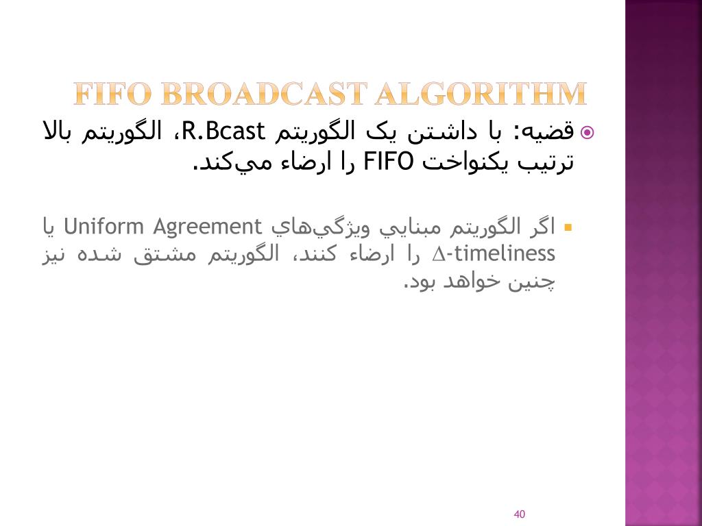 FIFO Broadcast Algorithm • قضيه: با داشتن يک الگوريتم R.Bcast، الگوريتم بالا ترتيب يکنواخت FIFO را ارضاء ميکند. • اگر الگوريتم مبنايي ويژگيهاي Uniform Agreement يا -timeliness را ارضاء کنند، الگوريتم مشتق شده نيز چنين خواهد بود.
