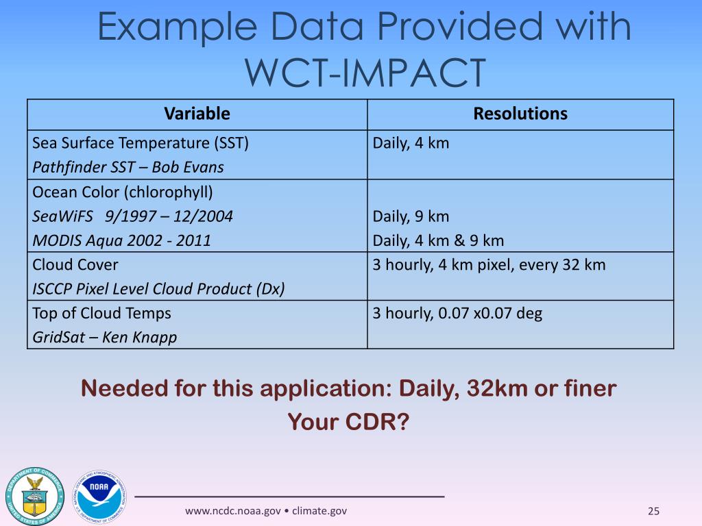 Example Data Provided with WCT-IMPACT Needed for this application: Daily, 32km or finer Your CDR? www.ncdc.noaa.gov • climate.gov
