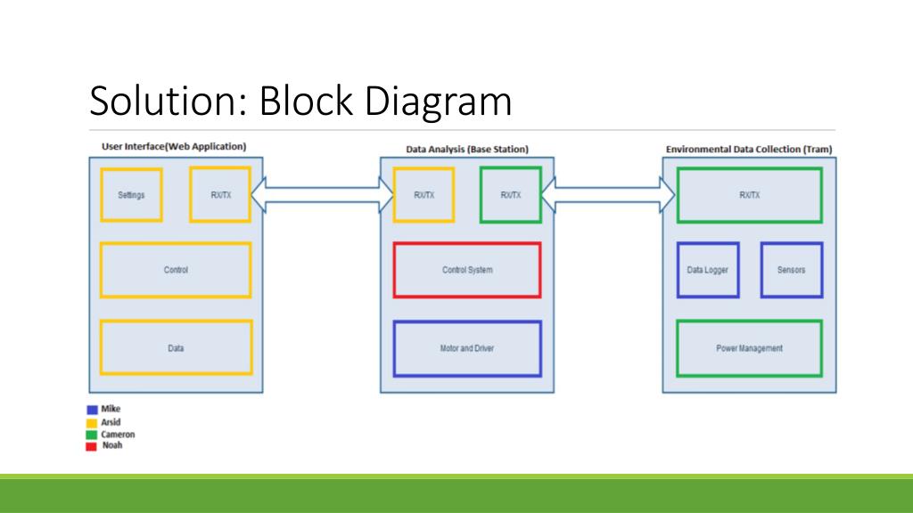 Proposed Solution: High Level Overview • Tram • Autonomously collects data from sensors • Transmits collected data to the base station • Tower (Base Station) • Communicates with tram, to give commands and receive environmental data • Send and receive commands and data to the UI over Ethernet • User Interface • Access and display recorded and real time data • Process user commands and transmit them to the base station